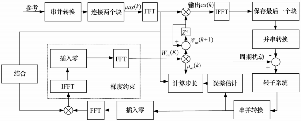 文獻[26]提出了一種基于頻域自適應(yīng)的LMS算法,單一通道不平衡振動自適應(yīng)控制框圖如圖14所示,其以諧波振動作為輸入,參考輸入為引入的與傳感器跳動具有相同分量的正弦信號,仿真結(jié)果表明該方法能有效提取磁懸浮轉(zhuǎn)子不平衡同頻振動信號。